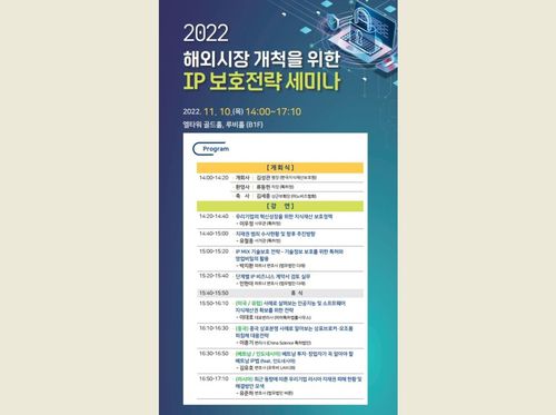(서울=연합뉴스) 유의주 기자 = 특허청은 10일 서울 서초구 엘타워에서 중소벤처기업부, 이노비즈협회, 한국지식재산보호원과 함께 '해외시장 개척을 위한 2022 지식재산(IP) 보호 전략 세미나'를 개최했다.