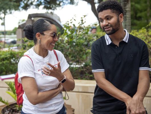 지난 6월 미국 플로리다주 최초의 여성 검사이자 당시 플로리다 검찰총장 후보인 아라미스 아얄라(왼쪽)가 플로리다 올랜도에서 열린 '론(디샌티스) 제거' 집회에서 맥스웰 프로스트(오른쪽)와 이야기를 나누고 있다. AP=연합뉴스 |