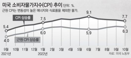 이날 미 노동부가 발표한 10월 소비자물가지수(CPI) 상승률 7.7%(전년 동월 대비)는 9월(8.2%)에 비해 소폭 둔화했다. 올해 2월 이후 처음으로 7%대로 내려앉은 수치다.