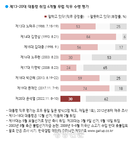 역대 대통령들의 취임 6개월 무렵 지지율을 비교하면, 이명박씨의 24%에 이어 2번째로 낮고, 노무현 전 대통령과 동률이다. 노태우 전 대통령은 53%, 김영삼 전 대통령은 84%, 김대중 전 대통령은 56%, 전직 대통령 박근혜씨는 59%, 문재인 전 대통령은 74%였다.