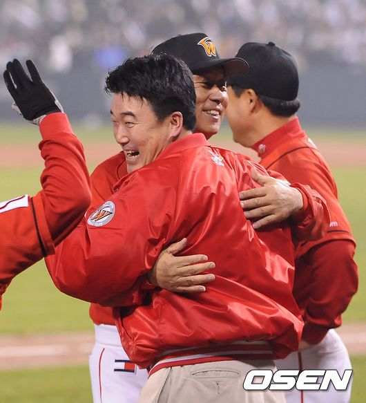 사진.(위로부터) 11월 8일 우승 직후 정용진 구단주와 민경삼 대표, 헹가래 받는 장면, 단장 때인 2010년 김성근 감독과 우승 기쁨을 나누는 모습, 선수시절인 1990년 LG 우승 시상식에서(앞줄 오른쪽에서 6번째가 민경삼)