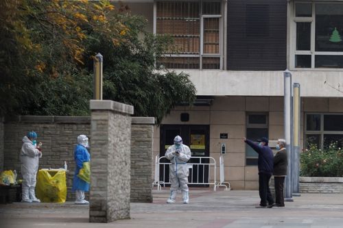코로나19 감염자 발생으로 봉쇄된 중국 베이징의 한 아파트 단지 앞을 방역요원들이 지키고 서 있다. 로이터연합뉴스 |