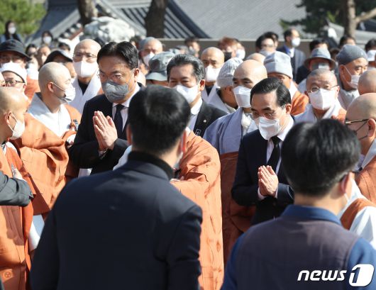 (서울=뉴스1) 신웅수 기자 = 정진석 국민의힘 비상대책위원장과 박홍근 더불어민주당 원내대표가 11일 오후 서울 강남구 봉은사에서 열린 이태원 참사 추모 법회에 참석하고 있다. 2022.11.11/뉴스1phonalist@news1.krCopyright ⓒ 뉴스1. All rights reserved. 무단 전재 및 재배포 금지.