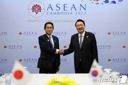 (서울=뉴스1) 오대일 기자 = 윤석열 대통령이 13일(현지시간) 캄보디아 프놈펜의 한 호텔에서 열린 한일 정상회담에서 기시다 후미오 일본 총리와 악수하고 있다. (대통령실 홈페이지) 2022.11.14/뉴스1kkorazi@news1.krCopyright ⓒ 뉴스1. All rights reserved. 무단 전재 및 재배포 금지.