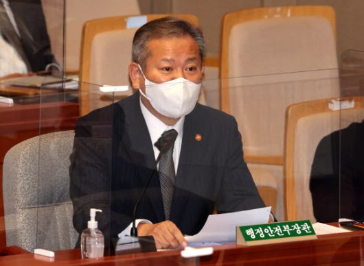 이상민 행정안전부 장관이 14일 오전 서울 여의도 국회에서 열린 예산결산특별위원회 전체회의에서 질의에 답변하고 있다.연합뉴스 |