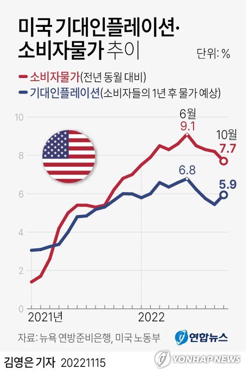 앞서 지난 10일 발표된 미국 10월 CPI 상승률(전년 동기 대비)은 전월(8.2%)과 시장 전망치(7.9%)보다 낮은 7.7%를 기록, 인플레이션이 둔화하기 시작했다는 전망이 확산했다.