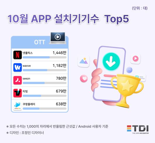 10월 기준 설치 수 Top5는 ▲넷플릭스(1,446만 대) ▲wavve(1,182만 대) ▲seezn(780만 대) ▲티빙(679만 대) ▲쿠팡플레이(638만 대)로 지난 9월과 비교해 순위 변동은 없었다.