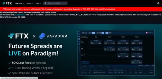 지난 14일 FTX 홈페이지 상단에 ‘출금이 불가능하다’는 공지가 적혀있다. 세계 3대 암호화폐 거래소 중 한곳인 FTX는 지난 11일 파산 신청을 했다. [사진 FTX 홈페이지]