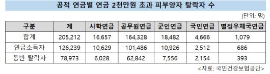 피부양자에서 탈락한 공무원연금 수급자들이 많은 것은 무엇보다 인원이 많은데다 2019년 기준으로 퇴직 공무원의 1인당 월평균 퇴직연금 수급액이 248만원(연간 2976만원)으로 연간 2000만원을 훨씬 넘는 등 수령액도 상대적으로 많기 때문으로 보인다.