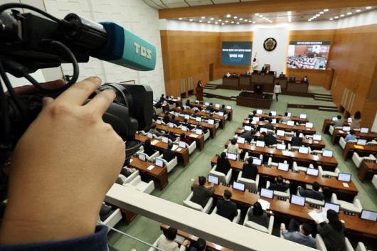 지난 15일 서울시 본회의 정례회에서 ‘서울특별시 미디어재단 TBS 설립 및 운영에 관한 조례 폐지조례안’이 통과된 가운데 16일 오전 서울 종로구 서울시의회 본회의장에서 TBS 취재진이 현장을 취재하고 있다. 뉴시스 |