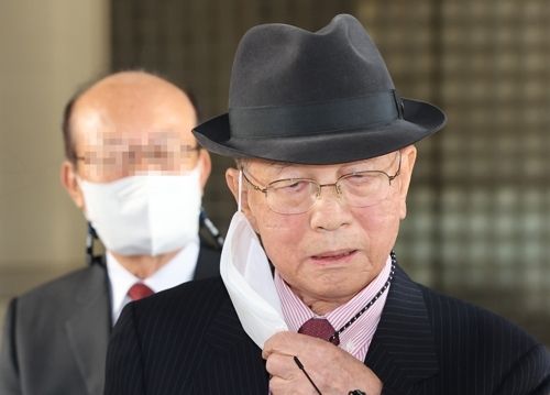 김기춘 전 대통령 비서실장이 16일 오전 열린 파기환송심 선고 공판을 마치고 서울고법을 나서며 취재진 질문에 답하기 위해 마스크를 벗고 있다. [자료=연합뉴스] |