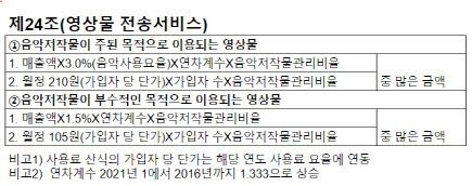 문체부가 수정·승인한 규정 개정안은 OTT 사업자에 대한 음악저작물 사용료율은 2021년 1.5%로 설정하고 연차계수를 적용해 서서히 2026년 1.9995%까지 늘린다는 규정 개정안이 담겼다. KT와 LG유플러스의 OTT 서비스인 시즌과 U+모바일tv에도 동일한 사용료율이 적용되며 양사는 반발했다. OTT 사업자에게만 과도한 부담을 지운다는 이유에서다.