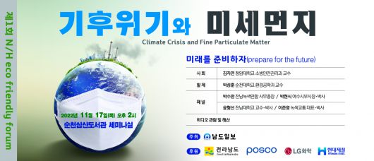 남도일보가 주최하고 전라남도가 후원하는 이번 에코포럼은 기후변화와 탄소중립 및 미세먼지 관련 기관 관계자와 시민 등 100여 명이 참석해 방안을 모색한다.