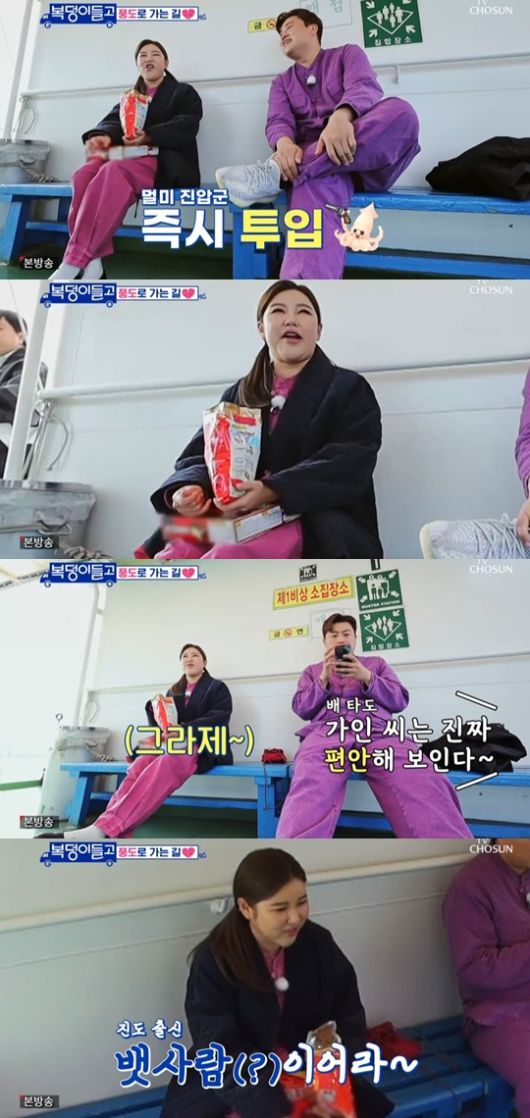 송가인은 "멀미를 할 때는 뭘 좀 씹으면 좋다, 새*달콤이나 오징어나" 라며, "누나 중학교 때 (진도에서) 판소리 학원을 목포로 다녀야 돼가지고 버스 타면 냄새 너무 나잖아. 오징어 한 마리를 비닐에 넣어갖구 뜯으며 다녔다" 고 자신의 경험담을 털어놨다. 제작진이 옆에서 "가인씨는 너무 편안해 보인다" 며 말을 걸었고 송가인은 "네, 저는 뱃*이니까" 라며 털털하게 받아쳐 웃음을 자아냈다.