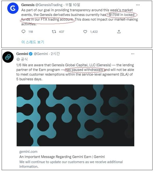 [FTX 계좌에 1억7500만달러가 묶여있음을 알리는 제네시스 트위터(위), 제미니언 프로그램의 출금을 일시 중단한다는 제미니 공식 트위터(아래), 자료=트위터] 2022.11.17 koinwon@newspim.com |