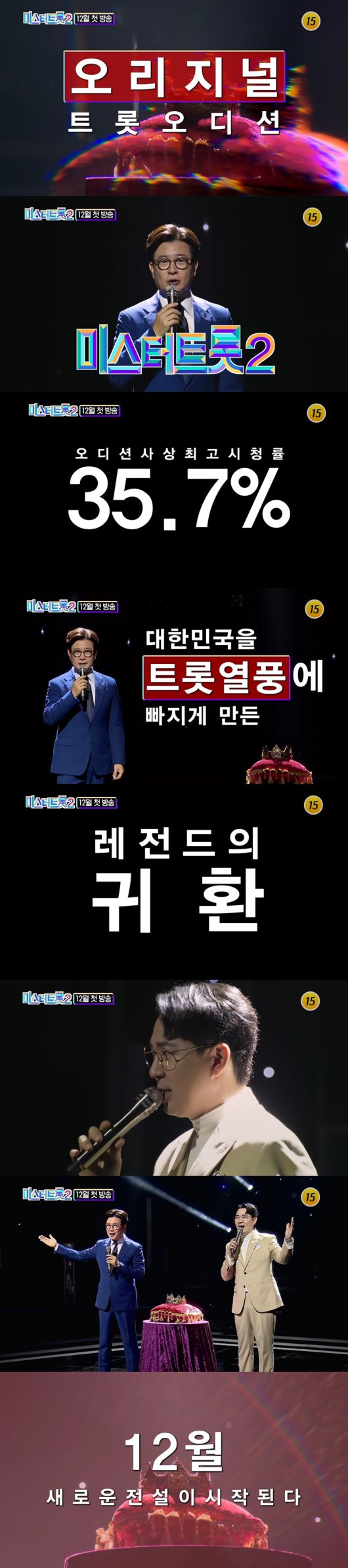 김성주는 "오디션 사상 최고 시청률 35.7%"라는 이전 시즌 '미스터트롯'이 남긴 전무후무 레전드 기록과 함께""전국민을 트롯 열풍에 빠지게 만든 레전드의 귀환"이라는 설명을 덧붙였다.