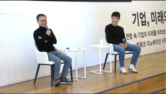 16일 서울 위워크 디자이너클럽에서 열린 위워크 이노베이션 서밋에서 권도균 프라이머 대표와 노태준 파트너가 대화를 나누고 있다. <위워크코리아 제공> |