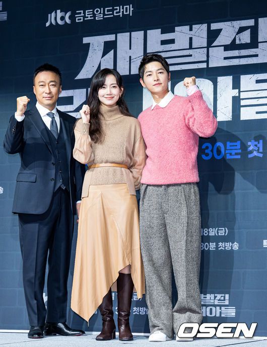 [OSEN=민경훈 기자] 17일 오후 서울 영등포구 여의도 페어몬트 앰배서더 그랜드볼룸에서 JTBC 금토일드라마 ‘재벌집 막내아들’ 제작발표회가 열렸다. 이 자리에는 정대윤 PD와 배우 송중기, 이성민, 신현빈이 참석했다. 이성민, 신현빈, 송중기가 무대 위에서 포토타임을 갖고 있다. 2022.11.17 / rumi@osen.co.kr