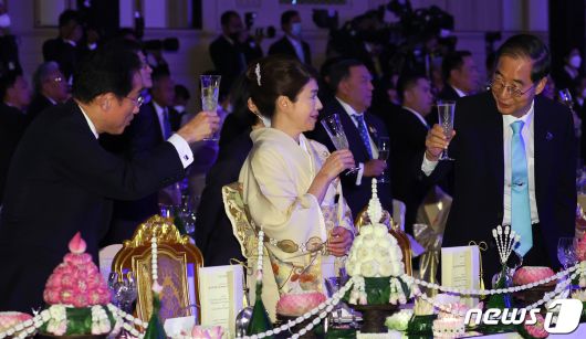 (방콕=뉴스1) 김명섭 기자 = 한덕수 국무총리와 기시다 후미오 일본총리 내외가 17일 오후(현지시간) 태국 방콕 왕립 해군 컨벤션홀에서 열린 아시아·태평양 경제협력체(APEC) 정상회의 갈라 디너에서 건배를 하고 있다. 2022.11.18/뉴스1msiron@news1.krCopyright ⓒ 뉴스1. All rights reserved. 무단 전재 및 재배포 금지.