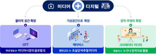 과학기술정보통신부가 18일 국내 OTT·메타버스(확장가상세계)·크리에이터 미디어 등 3대 축을 중심으로 한 '디지털 미디어·콘텐츠 산업혁신 및 글로벌 전략'을 발표했다. 이는 비상 경제장관회의에서 논의된 국정 과제인 '글로벌 미디어 강국' 실현을 위한 후속조치 일환이다.
