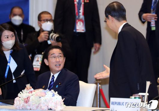 (방콕=뉴스1) 김명섭 기자 = 한덕수 국무총리가 18일 오전 (현지시간) 태국 방콕 QSNCC(Queen Sirikit National Convention Center)에서 열린 아시아·태평양 경제협력체(APEC) 정상회의 리트리트 세션1에서 기시다 후미오 일본총리와 인사를 하고 있다. 2022.11.18/뉴스1