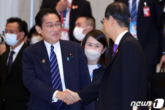 (방콕=뉴스1) 김명섭 기자 = 한덕수 국무총리가 18일 오전 (현지시간) 태국 방콕 QSNCC(Queen Sirikit National Convention Center)에서 열린 아시아·태평양 경제협력체(APEC) 정상회의 리트리트 세션1에서 기시다 후미오 일본총리와 인사를 하고 있다. 2022.11.18/뉴스1