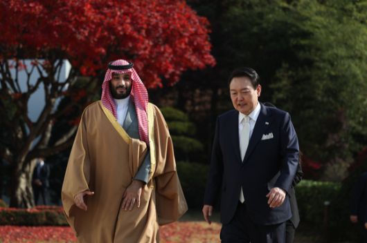 윤석열 대통령이 17일 서울 모처에서 무함마드 빈 살만 사우디아라비아 왕세자 겸 총리와 함께 걸으며 환담하고 있다. (사진=대통령실 제공) [사진=뉴시스] |