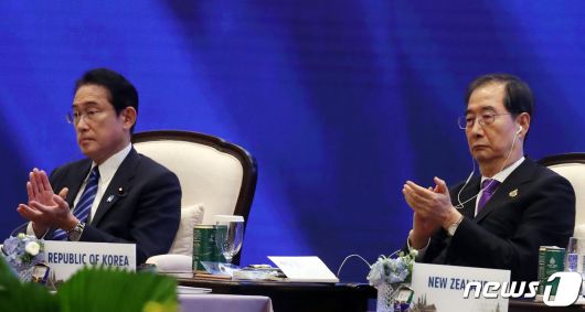 (방콕=뉴스1) 김명섭 기자 = 한덕수 국무총리가 18일 오후(현지시간) 태국 방콕 퀸시리킷 컨벤션센터(QSNCC)에서 열린 아시아태평양경제협력체(APEC) 정상회의 ABAC와의 대화에 참석해 박수를 치고 있다. 왼쪽은 기사다 후미오 일본 총리. 2022.11.18/뉴스1msiron@news1.krCopyright ⓒ 뉴스1. All rights reserved. 무단 전재 및 재배포 금지.