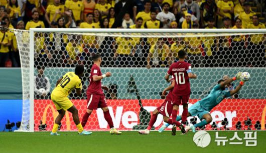 [카타르 로이터=뉴스핌] 박두호 기자= 에콰도르 이바라의 슛을 막고 있는 카타르 알 시브 골키퍼. 2022.11.21 walnut_park@newspim.com |