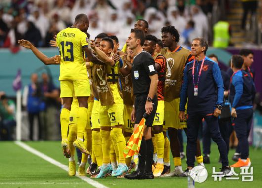 [카타르 로이터=뉴스핌] 박두호 기자= 에콰도르 발렌시아 선수가 전반 31분에 두 번째 골을 넣고 선수들과 환호하는 모습. 2022.11.21 walnut_park@newspim.com |