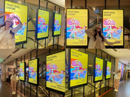 공개된 사진에는 ‘트로트 아이돌 두리, ’싱글2벙글‘ 응원합니다’라는 문구와 이번 앨범 재킷 이미지가 담긴 영화관 전광판 앞에서 다채로운 포즈로 카메라를 응시하고 있는 두리의 모습이 그려졌다.