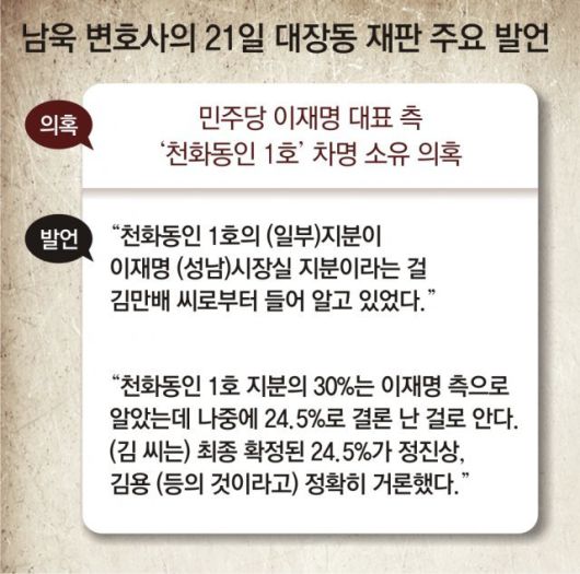 그는 2015년 2월 김 씨가 자신에게 “내 지분은 12.5%밖에 안 된다. 실제로 (김 씨 몫으로 알려진) 49.9% 중 나머지 37.4%는 이 시장 측 지분”이라고 말했다고 증언했다. 천화동인 1호는 화천대유가 100% 지분을 소유하고 있어 대외적으론 김 씨의 소유로 여겨진다. 남 변호사는 ‘이 시장 측이 구체적으로 누구냐’는 검찰 질문에 “(김 씨는) 2021년 대화 과정에서 최종 확정된 24.5%가 정진상 김용 (등의 것이라고) 정확히 거론했다”고 했다. 유동규 전 성남도시개발공사 사장 직무대리에 이어 남 변호사가 위증 시 처벌을 받는 법정에서 대장동 개발이익에 더불어민주당 정진상 대표실 정무조정실장과 김용 민주연구원 부원장의 지분이 있다고 증언한 것이다. 하지만 민주당 안호영 수석대변인은 “남 변호사가 말도 안 되는 황당한 주장을 늘어놨다. 삼인성호(三人成虎)로 없는 호랑이를 만들어내려는 것이며 예상을 한 치도 벗어나지 않는 윤석열 검찰 특유의 조작 수법”이라며 이 대표 등과의 관련성을 부인했다.