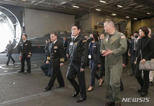 [사가미=AP/뉴시스]기시다 후미오 일본 총리(가운데)가 지난 6일 가나가와현 사가미만에서 열린 국제관함식에 참석했다. 미군의 항모 로널드 레이건호를 방문해 관계자에게 설명을 듣고 있다. 2022.11.22. |