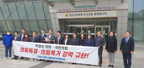 (성남=연합뉴스) 이우성 기자 = 경기 성남시의회 더불어민주당 의원들이 22일 "조례안 심사 기한을 일방적으로 정해 통보했다"고 밝힌 뒤 박광순 시의장의 사과와 재발 방지를 촉구하며 의사 일정 참여를 거부했다.