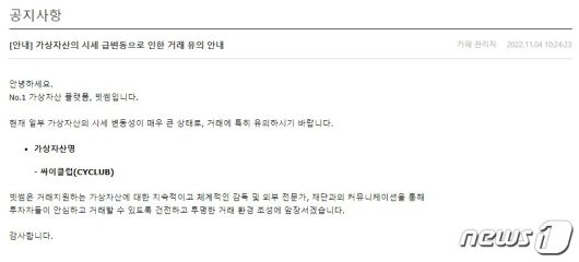 앞서 이날 빗썸은 전날 오후 3시 싸이클럽에 대한 거래 지원을 종료했다. 빗썸은 지난 3일 공지사항을 통해 싸이클럽의 거래지원 종료 시점을 미리 고지했다.