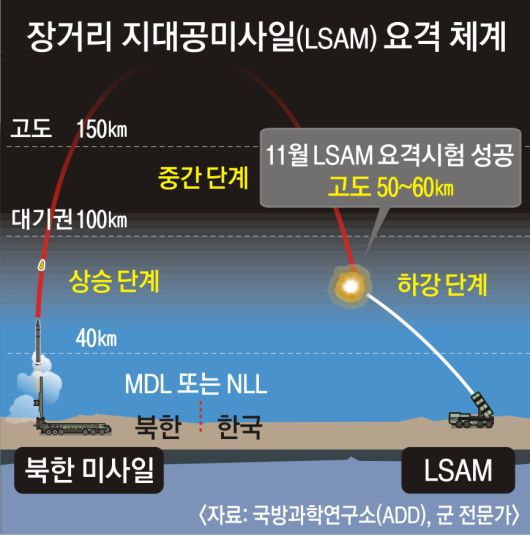 22일 군에 따르면 국방과학연구소(ADD)는 최근 LSAM으로 표적 미사일을 요격하는 시험 발사를 비공개로 진행해 성공했다. LSAM은 북한 탄도미사일이 고도 50~60㎞에서 비행할 때 요격하는 것을 목표로 개발 중이다. 지난 2월 표적 없이 미리 설정한 궤도를 따라 발사체를 쏘아 올리는 비행 시험에 성공했다. 군에서는 추가 시험 발사와 평가를 거쳐 2024년 말까지 LSAM 체계 개발을 완료하고 2026년 양산에 들어가 2027~2028년쯤 배치할 계획이다.