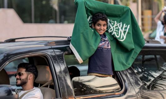 사우디아라비아가 22일(한국시각) 카타르 루사일 스타디움에서 열린 2022 카타르월드컵 조별리그 C조 1차전에서 아르헨티나를 꺾은 뒤 수도 리야드의 한 어린 축구팬이 승리 기쁨을 표현하고 있다. 리야드/AFP 연합뉴스 |