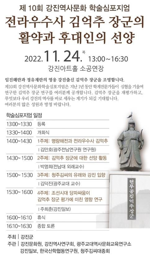 '전라우수사 김억추 장군의 활약과 후대인의 선양'을 주제로 열리는 제10회 강진역사문화 학술심포지엄은 4개의 주제 발표와 종합토론이 이어진다.