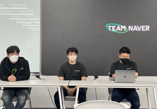 (왼쪽부터)네이버클라우드 윤규환 디지털컨버전스상품기획 리더, 네이버랩스 이동환 책임리더·백종윤 책임리더가 23일 경기도 성남시 분당구 '1784'에서 열린 테크포럼 스터디에서 기자들의 질문에 답하고 있다. /사진=이혜선 기자 |