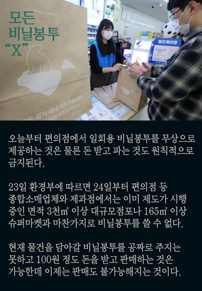 오늘부터 편의점에서 일회용 비닐봉투를 무상으로 제공하는 것은 물론 돈 받고 파는 것도 원칙적으로 금지된다. 23일 환경부에 따르면 24일부터 편의점 등 종합소매업체와 제과점에서는 이미 제도가 시행 중인 면적 3천㎡ 이상 대규모점포나 165㎡ 이상 슈퍼마켓과 마찬가지로 비닐봉투를 사용할 수 없다. 현재 물건을 담아갈 비닐봉투를 공짜로 주지는 못하고 100원 정도 돈을 받고 판매하는 것은 가능한데 이제는 판매도 불가능해지는 것이다.