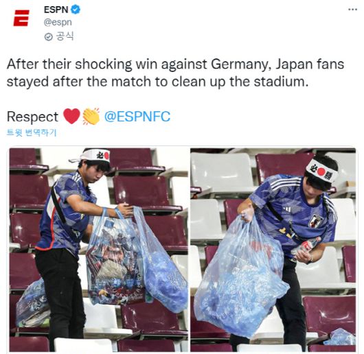 미국 스포츠 매체 ESPN은 24일(한국시간) ‘일본 팬들은 독일에 승리 거둔 후 경기장을 청소한다’는 제하의 기사를 보도했다. 매체는 “일본 팬들은 여러 대회에서 경기 후 해온 멋진 전통을 재현했다”면서 “그들은 경기 후 관중석에 남아서 수백 개의 파란 쓰레기봉투를 나눴고, 좌석 아래에 남겨진 쓰레기들을 모두 치웠다”고 설명했다.