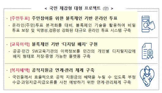 선거관리위원회의 온라인 투표 플랫폼인 ‘K-보팅’(Voting)을 광역시·도 규모의 온라인 주민투표에 활용할 수 있도록 블록체인을 도입해 신뢰성을 높인다. 공적지원금 관리에도 블록체인이 도입돼 중복 수급 등을 방지한다.