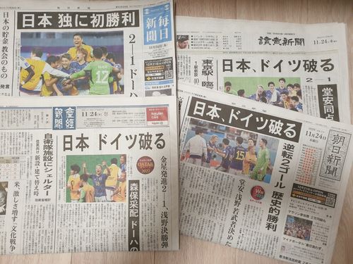 24일 요미우리·아사히·마이니치·산케이신문 등 일본 주요 조간신문은 자국 대표팀의 독일 격파 소식을 일제히 1면 톱기사로 다뤘다.