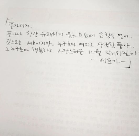 이어 공개된 사진에는 조세호가 풍자에게 쓴 손편지가 담겼다. 조세호는 "항상 유쾌하게 웃는 모습에 큰 힘을 얻어… 겉으로는 세보이지만… 누구보다 여리고 상냥한 풍자… 그 누구보다 행복하고 사랑스러운 12월 맞이하길 바라"라며 마음을 전했다.