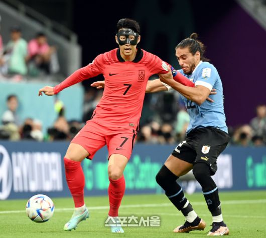 위기를 넘긴 한국은 전반 26분 역습 기회에서 마스크를 쓴 ‘캡틴’ 손흥민이 반격했다. 왼쪽 측면을 파고든 뒤 우루과이 수비 2명을 제치고 전매 특허인 오른발 감아 차기 슛을 시도했다. 그러나 공은 상대 머리에 맞고 튀어올랐다.