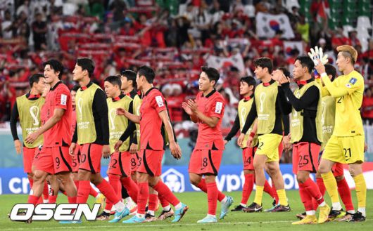 [OSEN=도하(카타르), 박준형 기자] 파울루 벤투 감독이 이끄는 축구대표팀은 24일 카타르 알 라이얀에 위치한 에듀케이션시티 스타디움에서 우루과이를 상대로 ‘카타르 월드컵 2022 H조 조별리그 1차전’에서 0-0 무승부를 기록했다. 한국은 2010년 남아공 월드컵 이후 12년 만에 16강 진출에 도전한다.경기 종료 후 한국 선수들이 관중석을 향해 인사를 하고 있다. 2022.11.24 /soul1014@osen.co.kr |