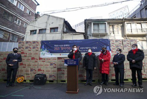 지난해 사랑의 희망박스 행사에서 인사말 하는 오세훈 시장 |