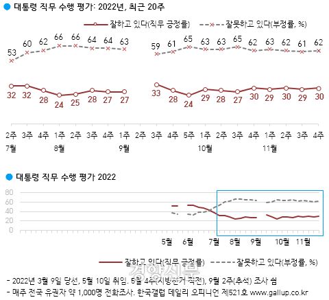 여론조사기관 한국갤럽이 지난 22~24일 전국 만18세 이상 1002명에게 윤 대통령이 대통령으로서 직무를 잘 수행하고 있다고 보는지 물었더니, ‘잘하고 있다’는 응답은 30%, ‘잘못하고 있다’는 응답은 62%로 나타났다. 그 외는 ‘어느 쪽도 아님’ 2%, ‘모름, 응답 거절’ 5%였다.