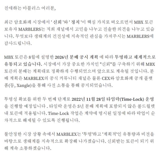이어 마브렉스(MBX) 토큰은 8월에 설명한 2026년 분배 공시 계획에 따라 투명하고 체계적으로 유통되고 있다고 설명했다. 시장에서 가장 중요한 가치인 신뢰를 구축하기 위해 MBX 토큰 분배는 계획대로 정확하게 수행됐으며 앞으로도 그럴 것이라고 밝혔다.