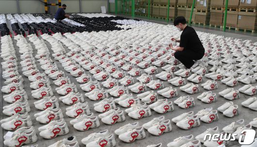 26일 부산 강서구 부산세관신항지정장치장에서 직원들이 중국산 짝퉁 운동화 압수품을 공개하고 있다. 2021.8.26/뉴스1 ⓒ News1 여주연 기자 |